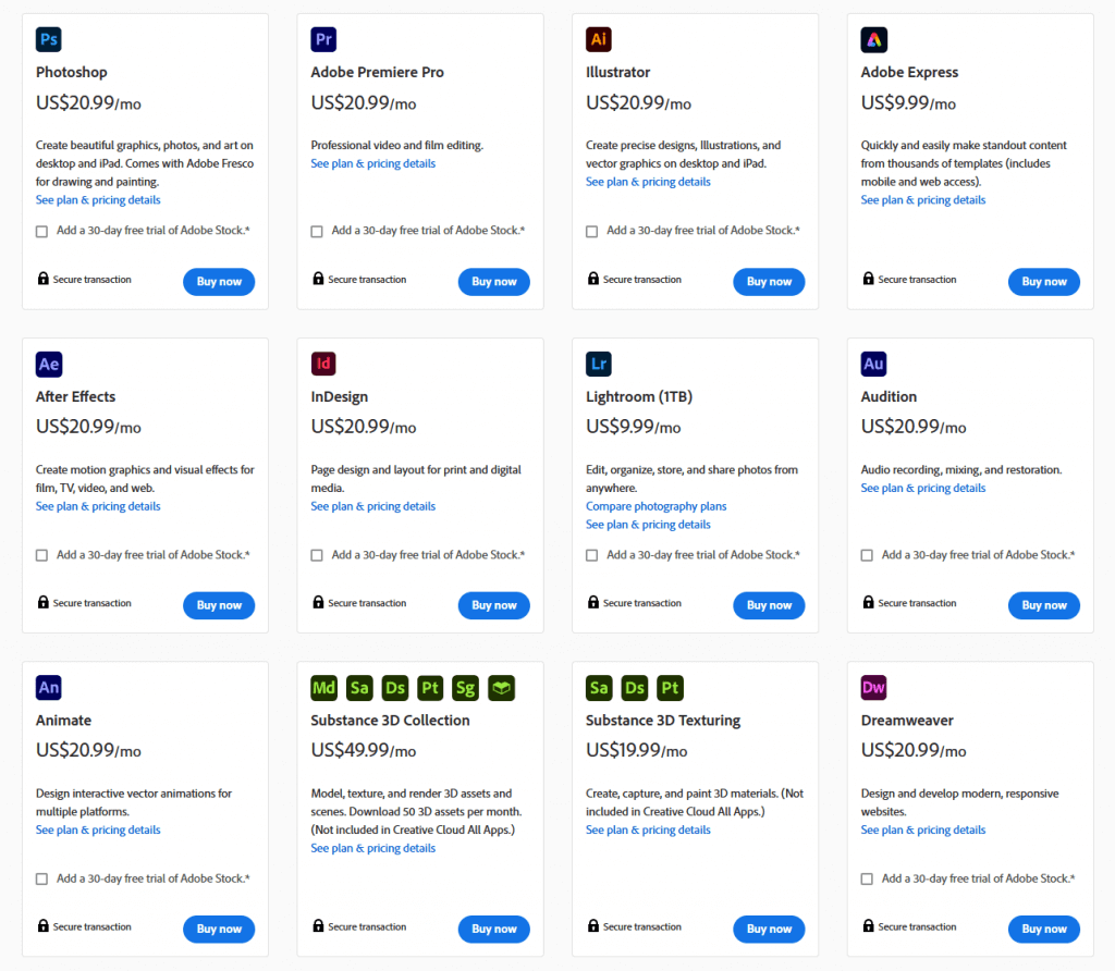 Jos haluat peruuttaa Adobe Acrobat Pro- tai Photoshop-tilauksesi, joudut luopumaan myös muista Adobe Creative Cloudin osista, kuten Adobe Stockista ja Indesignista.