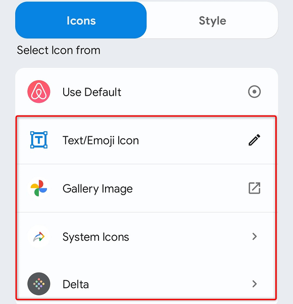 - Valitse kuvakeesi lähde. Täältä voit valita kuvan galleriastasi, käyttää hymiötä tai tekstiä tai saada kuvakkeen asennetusta kuvakepaketistasi.