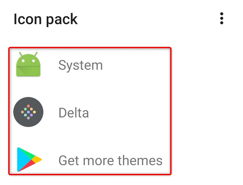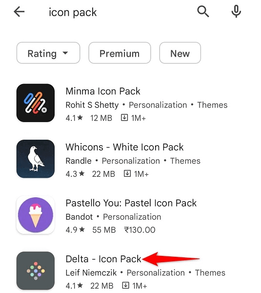 - Napauta hakukenttää, kirjoitakuvakevyja painaKirjoittaa. Näet hakutuloksissa erilaisia kuvakepakkauksia. Lataamme ja käytämmeDelta - Icon Pack.