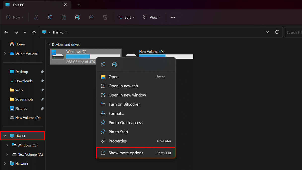 - NapsautaTämä PCvasemmasta ruudusta > "Laitteet ja asemat" -osio, napsauta hiiren kakkospainikkeella asemaa, jonka haluat nimetä uudelleen ja valitse "Näytä lisää vaihtoehtoja".
