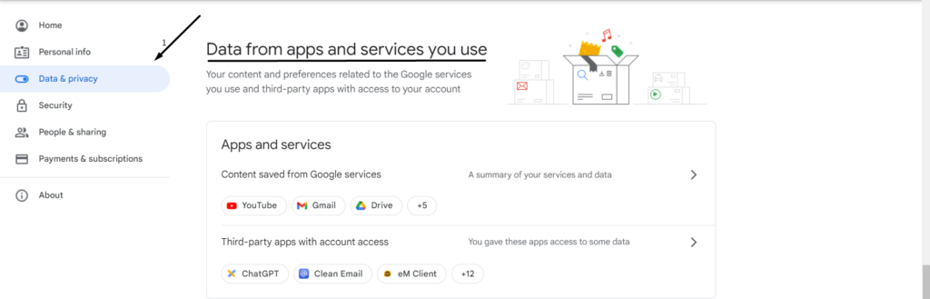 2.Kun olet kirjautunut sisään Google -tiliisi, valitseTiedot ja yksityisyysVaihtoehto vasemmasta sivupalkista ja siirryTiedot käyttämästäsi sovelluksista ja palveluista.