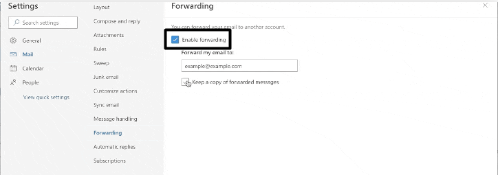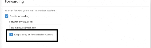 4.RastiOta edelleenlähetysValintaruutu ja kirjoita uusi sähköpostiosoitteesiVälitä sähköpostini osoitteeseen:tekstikenttä.