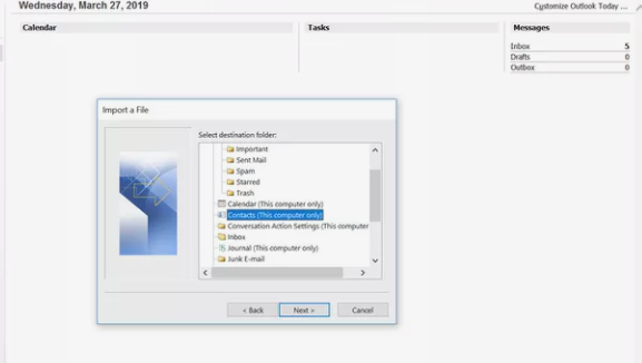 7.Valitse Outlook -kansio, johon haluat tuoda kaikki yhteystiedotTuo tiedostokehote.
