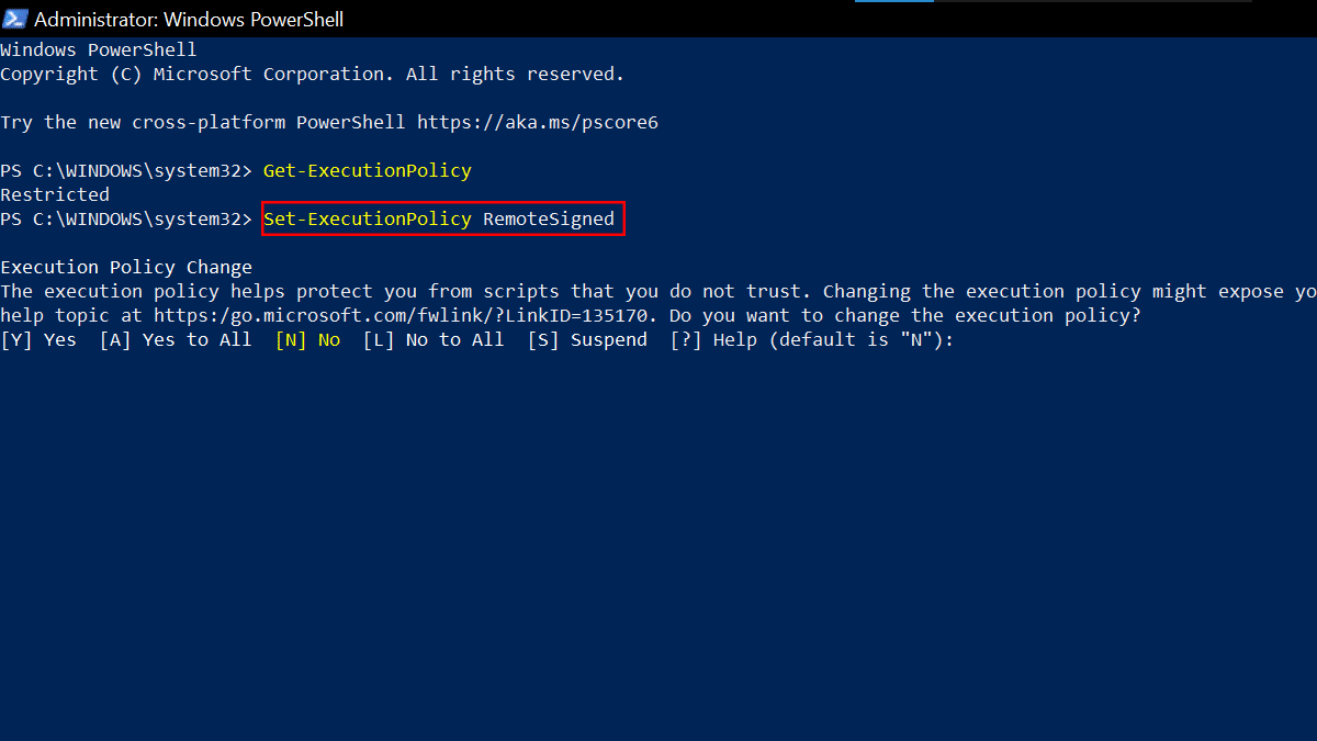Jos yrität suorittaa komentosarjan Windows 11: ssä, sinun on muutettava paikallisen tietokoneen, nykyisen käyttäjän tai istunnon suorituskäytäntöä.