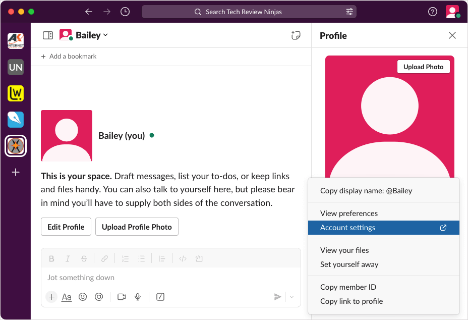 - Noudata samoja vaiheita kuin yllä, jotta pääset Slack -tiliasetuksiin.