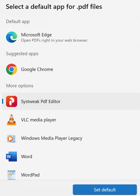 Vaihe 6:Valitse sovellus, jonka haluat olla oletus PDF -lukija ja napsauta SET -oletuspainiketta.