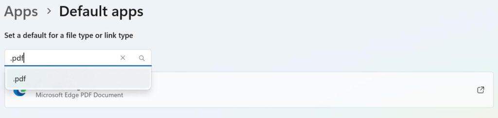 Vaihe 5:Nykyinen oletussovellus avataan PDF -tiedostot näkyvät, kun kirjoitat “.pdf” hakukenttään kohdassa “Aseta tiedoston oletus…”.