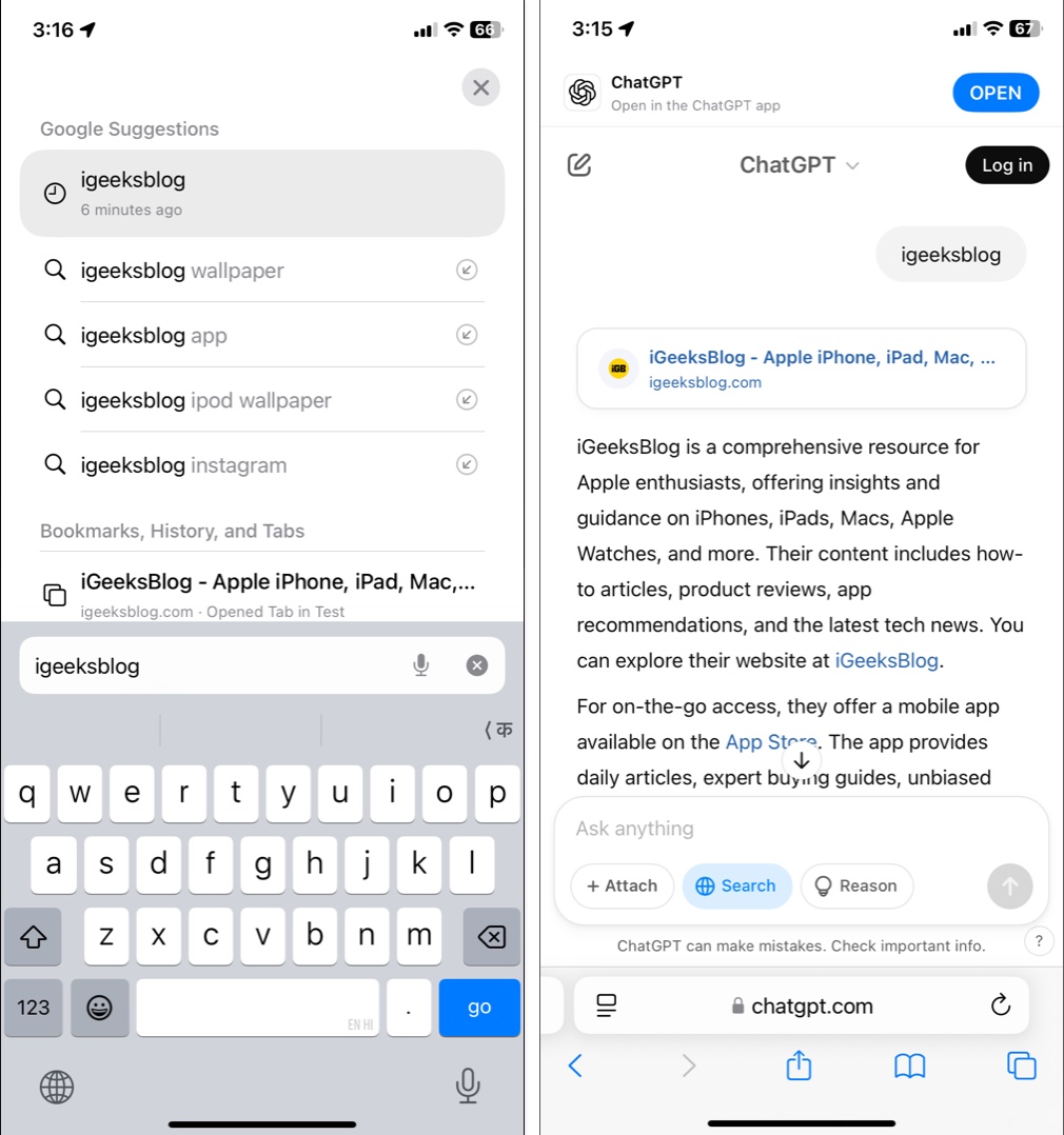 Nyt kun olet asettanut chatgPT: n oletushakukoneeksi, käynnistäSafari, Syötä kaikki kyselyt hakupalkilla ja napautaMennänäppäimistöllä. Sinut ohjataan ChatgPT -verkkosivustolle henkilökohtaisella vastauksella kyselyyn. Täällä voit liittää kuvia tai asiakirjoja tai tehdä vastauksen tarkemmin käyttämällä ChatgPT: n Reason -ominaisuutta.