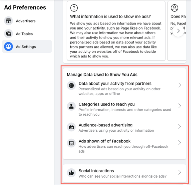 ValitaMainosasetuksethallitaksesi mainosten näyttämiseen käytettyjä tietoja. Tämä osa sisältää viisi aluetta, joita voit mukauttaa:
