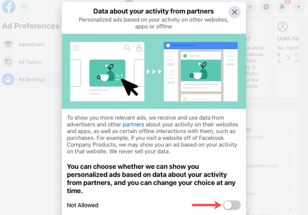 - Tietoja toiminnastasi kumppaneilta: Tämä sisältäähenkilökohtaiset mainoksetperustuen toimintaan. Lopettaaksesi henkilökohtaisten mainosten näkeminen vaihda vaihdeEi sallittua.