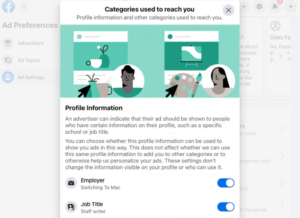 Kun olet laskeutunut mainosasetusten sivulle, käytä alla olevia osioita räätälöityksesi kiinnostuksen kohteillesi näkemäsi mainokset.