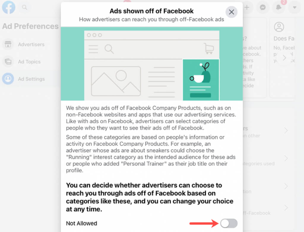 - Facebookista esitetyt mainokset: Tämä sisältää mainokset, jotka näet muilla kuin Facebook-sivustoilla tai sovelluksilla, jotka käyttävät Facebookin mainospalveluita. Voit vaihtaa vaihteenEi sallittua.