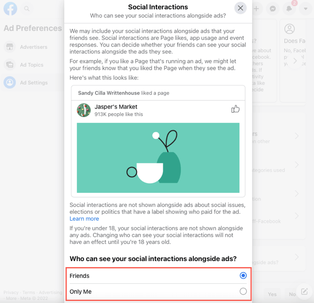 - Sosiaalinen vuorovaikutus: Tähän sisältyy mainosten näyttäminen sen perusteella, mitä Facebook -ystäväsi näkevät. Kuten esimerkki lukee:
