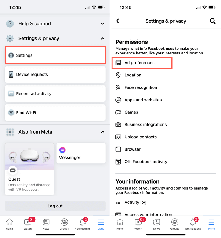 Pääsy Facebook -mainosasetuksiin mobiilisovelluksessa