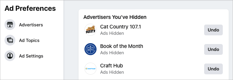 ValitaMainostajatnähdäksesi ne, jotka olet nähnyt viimeksi. Piilotaksesi yhden luettelon mainostajista, valitsePiilottaa mainoksetheidän nimensä oikealla puolella. Kun teet tämän,Piilottaa mainoksetPainike muuttuuKumotaPainike, jos muutat mieltäsi.