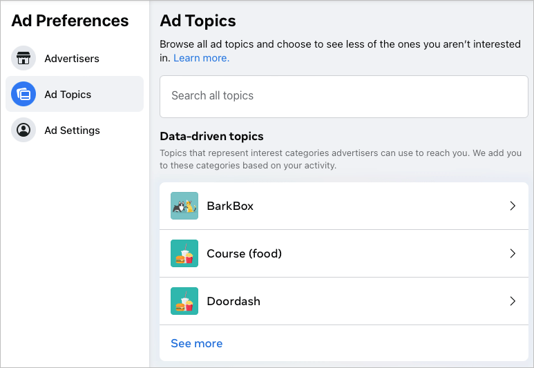 ValitaMainosaiheetJos haluat nähdä tietopohjaiset aiheesi. Nämä ovat mainosluokkia, jotka koskevat sinua Facebook -toiminnan perusteella. Ne voivat vaihdella ruoasta kauneuteen musiikkiin tekniikkaan ja sen ulkopuolelle.