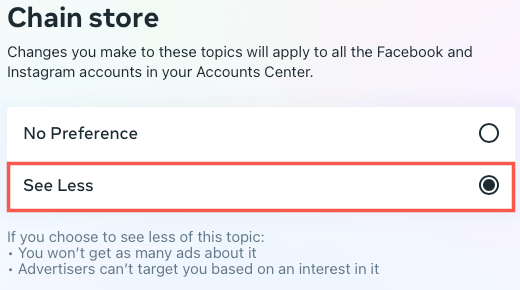 Jos haluat nähdä vähemmän mainoksia tietystä aiheesta, valitse se luettelosta. Valitse sittenNähdä vähemmän.