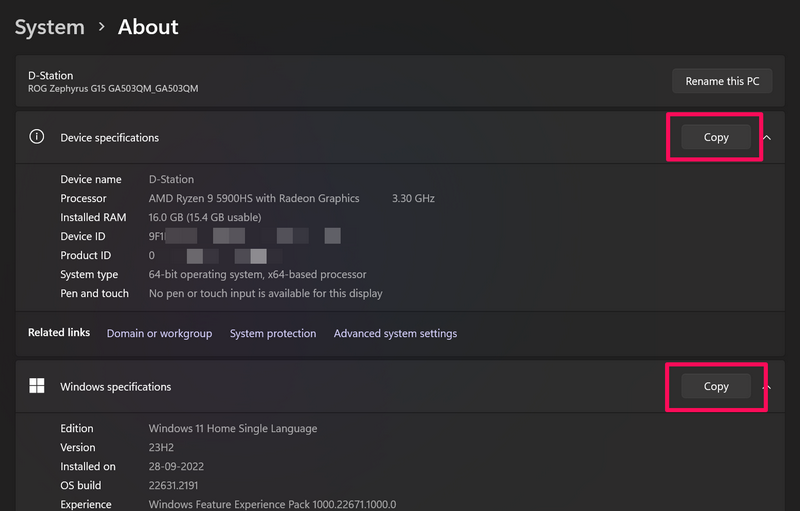 6.Tästä eteenpäin voit tarkistaa Windows 11 -tietokoneen tai kannettavan tietokoneen tekniset tiedot, vaan myös kopioida ne omistautuneellaKopioidaPainikkeet toimitetuissa osioissa.