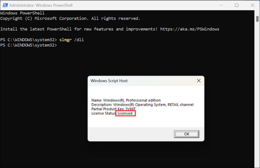 Windows PowerShell on skriptikieli, jota käytetään tehtävien automatisointiin ja Windows -järjestelmien hallintaan. Se on tehokkaampi kuin komentokehote, ja sitä voidaan käyttää myös Windows 11 -lisenssiavaimen aidon tilan tarkistamiseen. Komento on täsmälleen sama kuin komentokehotteen.