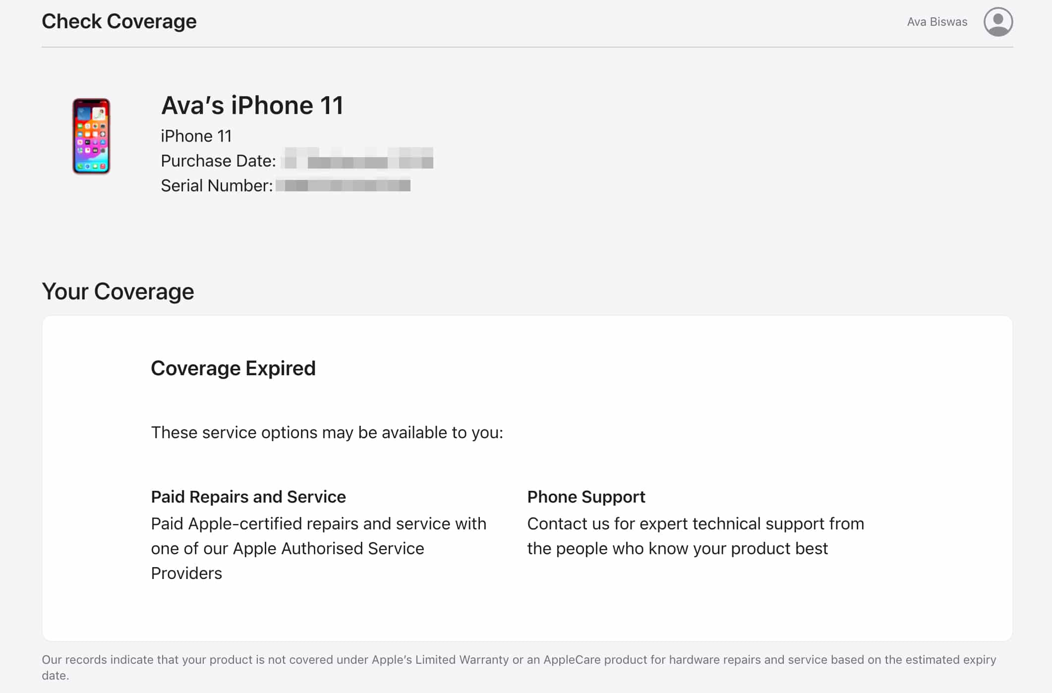 Saatat nyt nähdä palvelusi ja tukitakuun tilan, mukaan lukien mitä kattavuus sisältyy, kuten voimassa oleva ostopäivä, puhelintuki, korjaukset ja palvelun kattavuus ja paljon muuta.