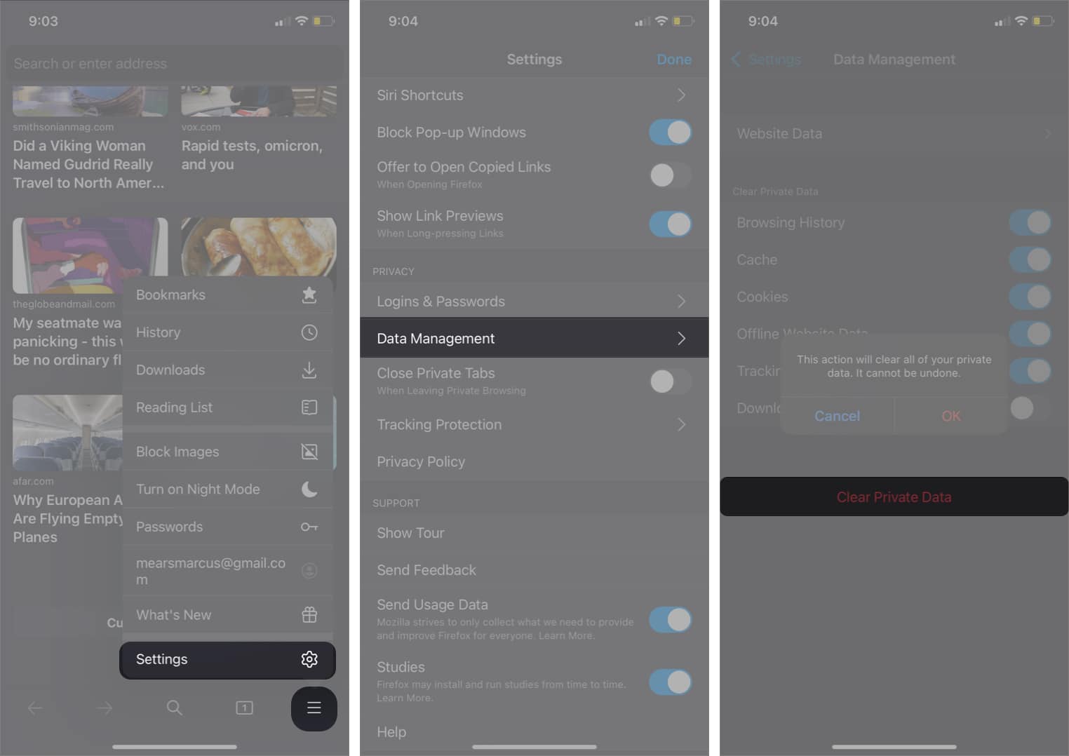 | Firefox | Firefox> ☰> Asetukset | Tietosuoja> Tiedonhallinta> Vaihda välimuisti> Selvitä yksityinen tieto |