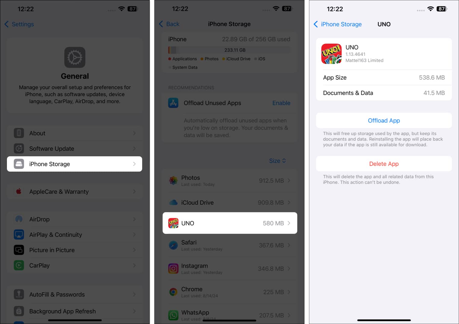 Välimuistin perusteellisemman poistoa varten poista ja asenna sovellus uudelleen: Tämä prosessi varmistaa, että kaikki sovellukseen liittyvät väliaikaiset tiedostot ja välimuistitiedot poistetaan kokonaan laitteestasi. Asenna sovellus laitteen App Storesta aloittamisen jälkeen uudelleen asennuksen poistamisen jälkeen, mikä voi auttaa ratkaisemaan vioittuneen tai vanhentuneen välimuistin aiheuttamat pysyvät ongelmat.