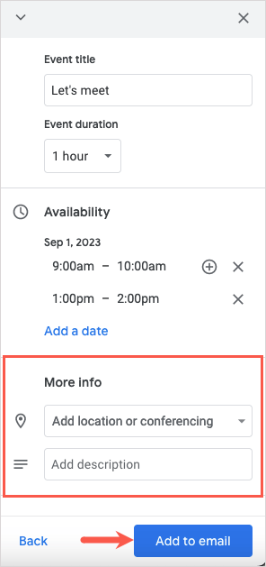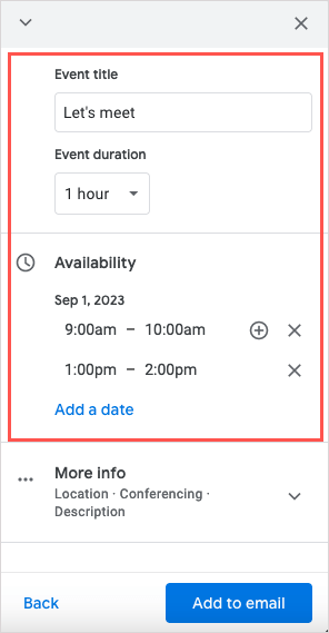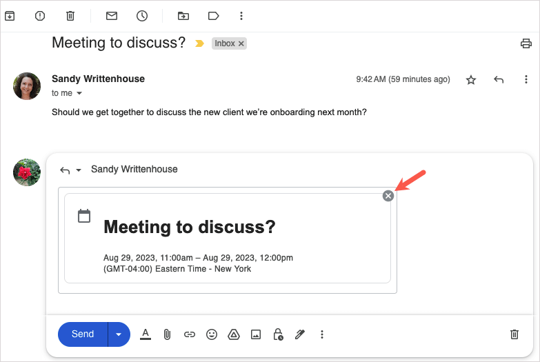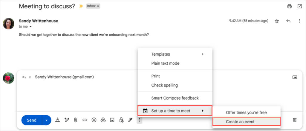 Luotpa sitten tapahtuman kirjoittamastasi sähköpostista tai vastaat vastaanottajalle ja kerrot vapaat ajat, Gmailin ja Google-kalenterin integrointi tekee ajoittamisesta helppoa.