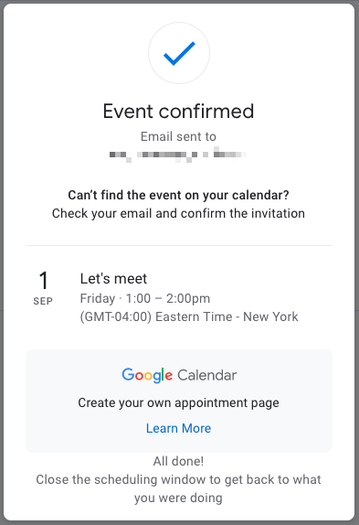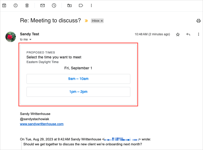 Kun olet noudattanut yllä olevia ohjeita lähettääksesi käytettävissä olevat ajat vastaanottajallesi, hän voi valita sähköpostissa yhden päivämäärän ja aikavälin hyväksyäkseen ja ajoittaakseen tapahtuman.