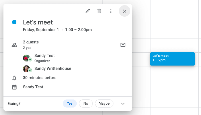 Jos hyväksyt, tapahtuma avautuu Google-kalenterissa, tallennetaan ja vahvistetaan.