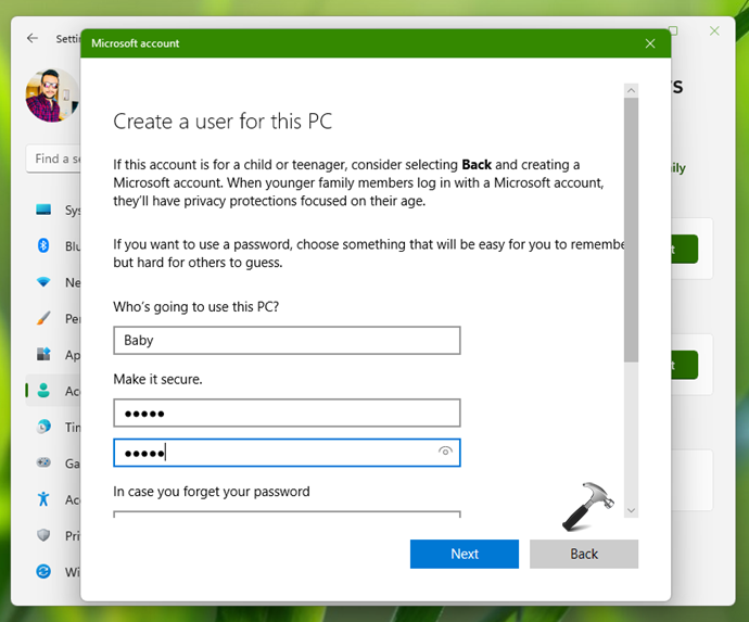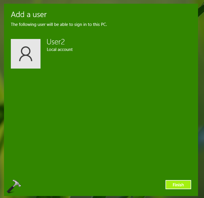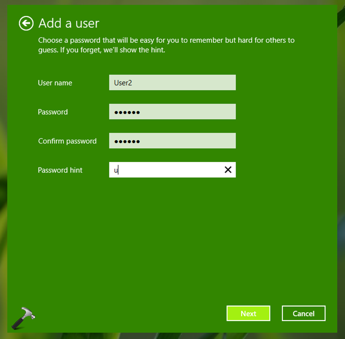 5.Kirjoita nyt luota käyttäjä tälle tietokoneelle, kirjoita paikallinen käyttäjätilin nimi, jota seuraa salasana.