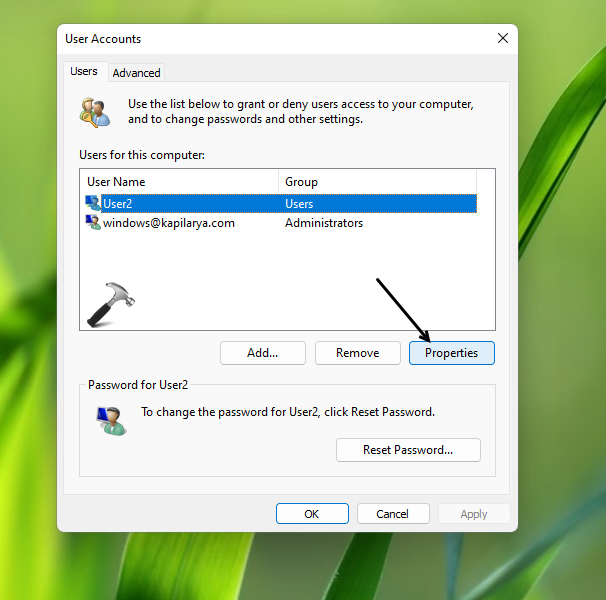 7.Nyt takaisin käyttäjätilien ikkunasta, valitse äskettäin luotu paikallinen tili ja napsautaOminaisuudet.