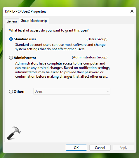 8.Siirry kiinteistölevyllä ryhmäjäsenyys -välilehteen. Täällä voit muuttaa kyseistä paikallista tilityyppiä ja jos haluat, voit tehdä siitä järjestelmänvalvojan. Napsauta OK.