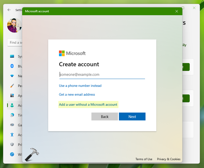 4.Napsauta seuraavassa näytössäLisää käyttäjä ilman Microsoft -tiliä.