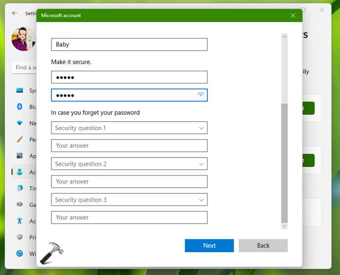 6.Jos lisäät salasanan tälle uudelle paikalliselle tilille, sinun on lisäksi luotava joitain turvakysymyksiä, joiden avulla voit nollata salasanan, kun unohdat sen. Kun olet valmis, napsautaSeuraava.