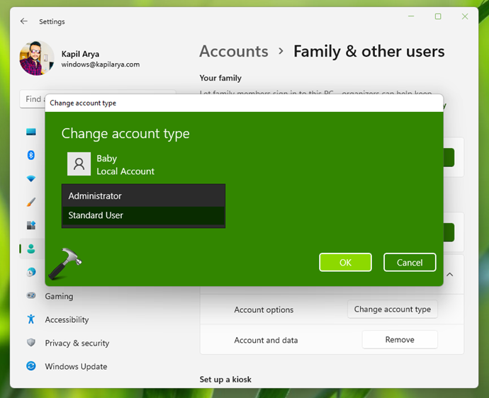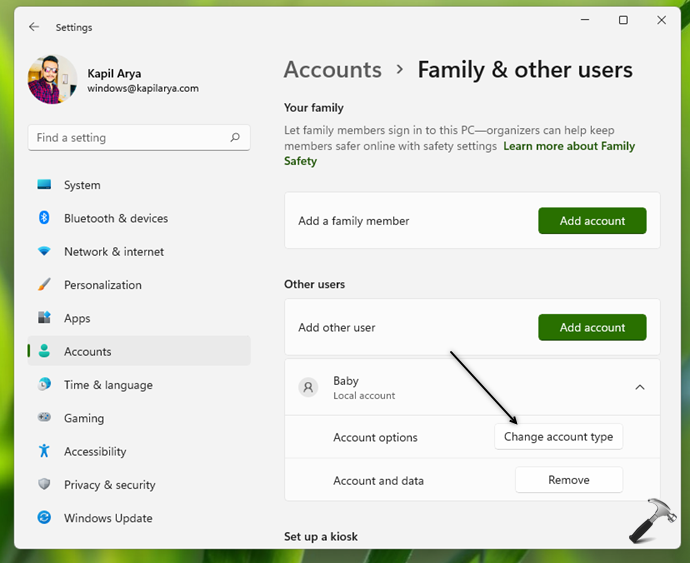 7.Joten uusi paikallinen käyttäjätili on lisätty järjestelmään. NapsauttaaVaihda tilityyppiPainike muokata sen käyttötasoa.