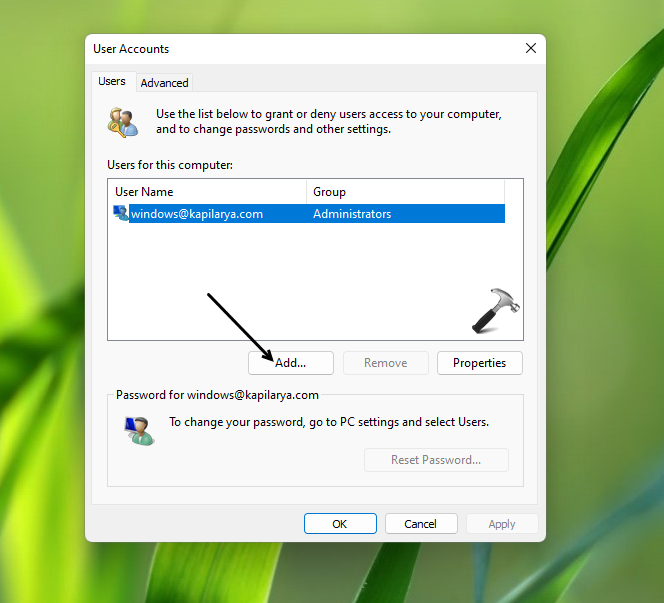 2.Napsauta käyttäjätilien alla käyttäjätileissäLisätä.