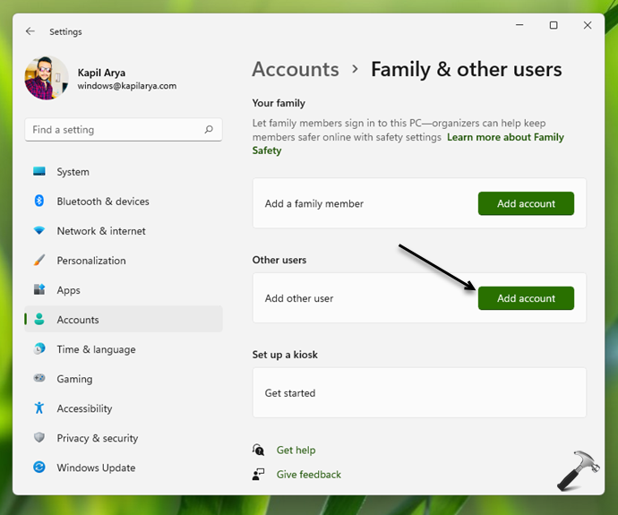 2.Mennä jhkTilit> Perhe ja muut käyttäjät. Napsauta muiden käyttäjien allaLisätä tiliä.