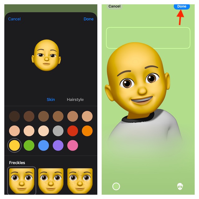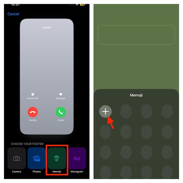 - Sitten voit valita olemassa olevan muistion tai tehdä uuden. Tätä varten napauta"+"Painike -> Valitse Memoji -kasvot ja mukauta se.