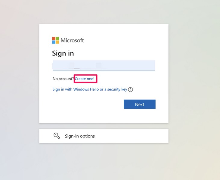 4.Napsauta seuraavassa kirjautumiskehotteessaLuo sellainen!-painiketta aloittaaksesi uuden Microsoft-tilisi luomisen.