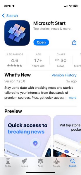 1.Android- tai iOS-laitteellasiasenna Microsoft-sovellusalkaenPlay KauppataiApp Storesta. Tätä demoa varten olen asentanut uudenMicrosoft Startsovellus iPhonessani. Voit asentaa tämän tai minkä tahansa muun Microsoft-sovelluksen, kuten Outlookin, Wordin, OneDriven ja muut.
