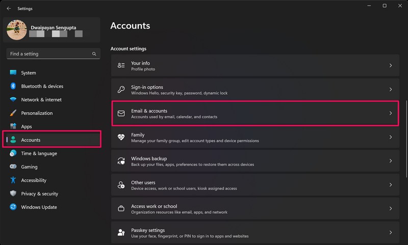 2.Siirry kohtaanTilit-välilehteä vasemmassa navigointipalkissa ja napsautaSähköposti ja tilitasetukset oikeassa ruudussa.