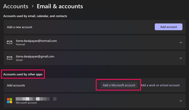 3.Napsauta seuraavalla sivullaLisää Microsoft-tili-painiketta kohdan Lisää tilit -vaihtoehdon vieressäTilit muiden sovellusten käyttämäosio.
