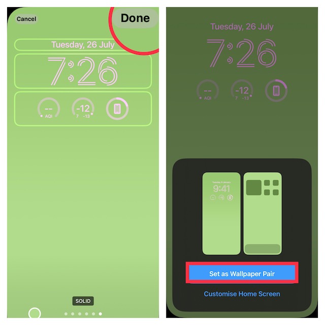 5.Seuraavaksi napautaTehtynäytön oikeassa yläkulmassa ja valitse sittenAseta tapettipariksiAsettaa taustakuva sekä aloitusnäytölle että lukitusnäytölle. Jos haluat mukauttaa aloitusnäytön erikseen, napauta mukauteta aloitusnäyttö ja tee sitten tarpeelliset.