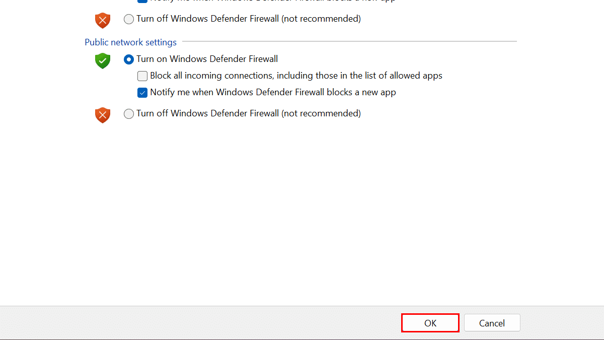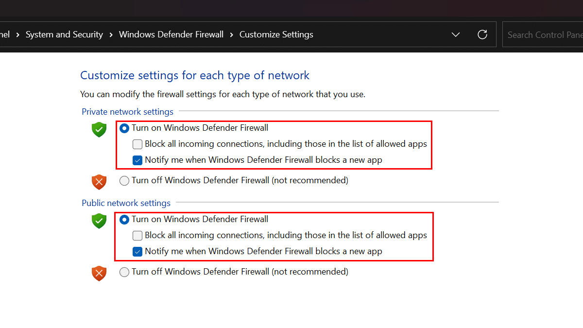 - Valitse ”Kytke Windowsin puolustajan palomuuri päälle”Vaihtoehto"Yksityiset verkkoasetukset”Osa> Valitse”Kytke Windowsin puolustajan palomuuri päälle”Vaihtoehto"Julkisen verkon asetukset”Osa.