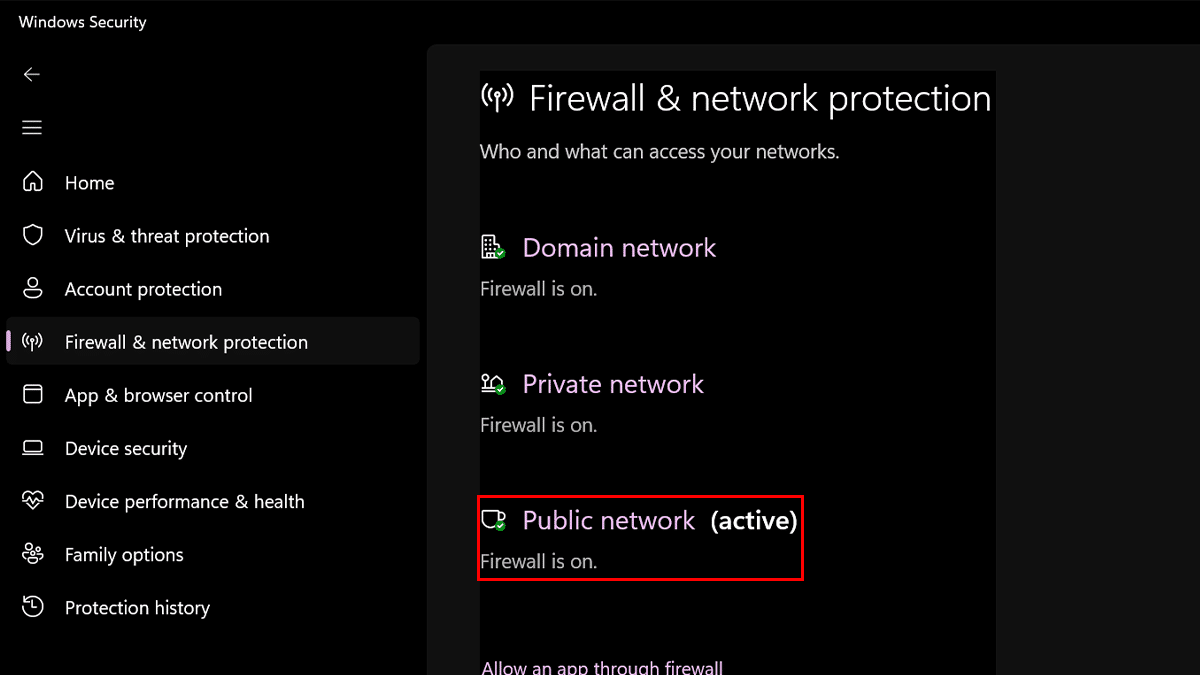 - Kun valmistettu palomuuri estää aktiivisen verkkoprofiilin käytöstä. Voit myös sammuttaa kaikkien verkojen palomuurin menetelmällä, mukaan lukien “Domain Network”, “Private Network” ja “Public Network”.