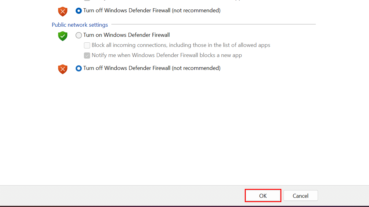 - Valitse ”Sammuta Windows Defender -palomuuri”Vaihtoehto"Yksityiset verkkoasetukset”Osa> Valitse”Sammuta Windows Defender -palomuuri”Vaihtoehto"Julkisen verkon asetukset”Osa.