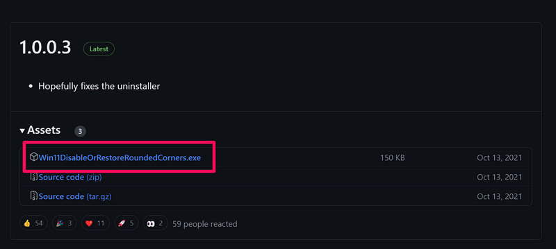 1. Mennä githubiinja lataaWin11DisableRestorerOundCornerstyökalu web -selaimen avulla. VarmistaLataa .exe -tiedostoluettelosta.