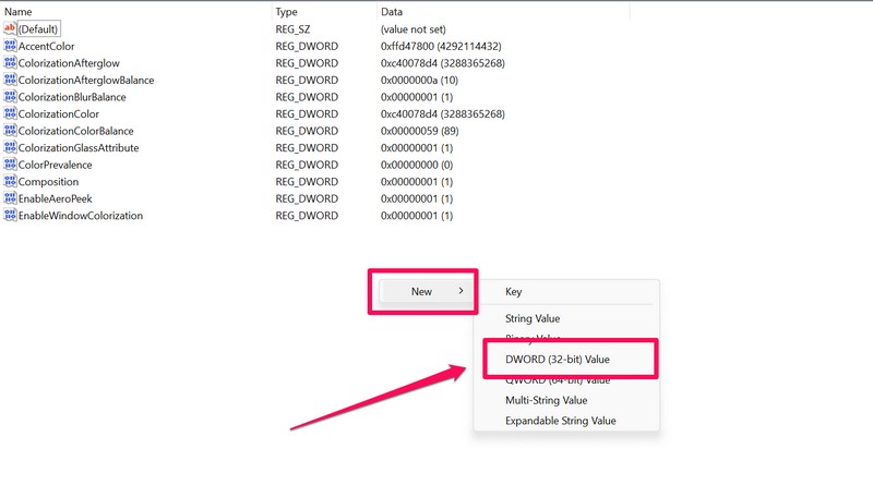 6.Alavaltion allaUusiNapsauta vaihtoehtoaDWORD (32-bittinen) arvovaihtoehto. Tämä luo uuden 32-bittisen arvon Desktop Window Manager (DWM), joka vastaa graafisten käyttöliittymien luomisesta Windows 11: n laitteistokiihdytyksellä.