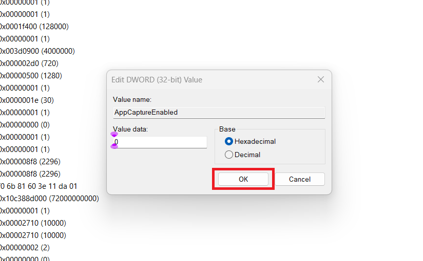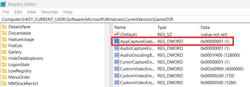 ComputerHKEY_CURRENT_USERSOFTWAREMicrosoftWindowsCurrentVersion GameDVR4.VuonnaPahuuskansio, kaksoisnapsautaAppCaptureEnabledvaihtoehto.