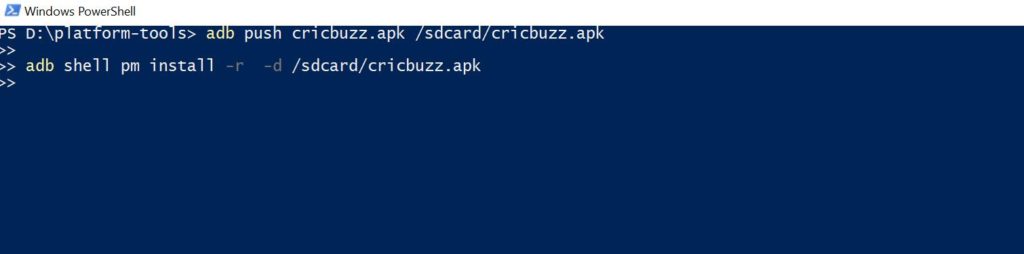Adb push cricbuzz.apk /sdcard/cricbuzz.apk